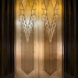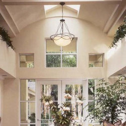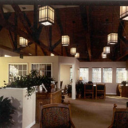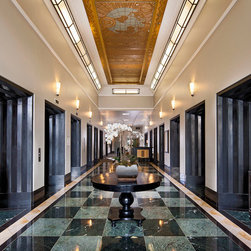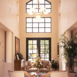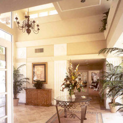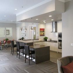 This contemporary kitchen uses white laminate cabinets, stainless steel appliances, and synthetic stone countertops to provide a slick place to sit and work. The floor in the kitchen is cork, and the remainder of the floor is covered in commercial carpet squares.