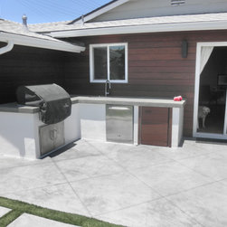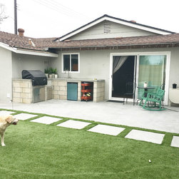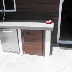 Backyard remodel with a Trex deck, rough cedar pergolas, water feature