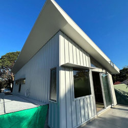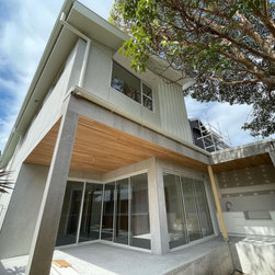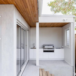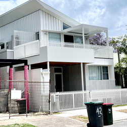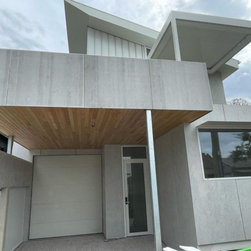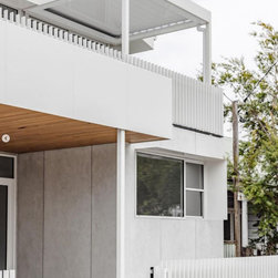 Two storey new house in tight Inner City block with metal wall cladding and cement sheet cladding with timber ceiling linings for added warmth. A very urban dwelling that takes advantage of the lot with breakout space to the rear with the ground floor open plan area and additional outdoor space off the media room upstairs. An undercover single car gagae with stacked parking for another carspace out side with stirage hatches along the side fence creating privacy.