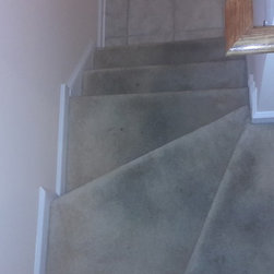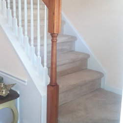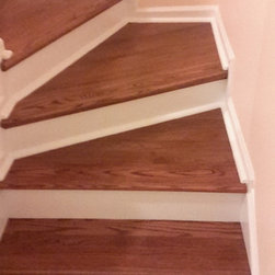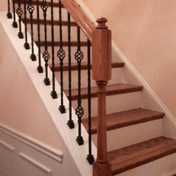 After. Stair Retreads(replace carpet with hardwood steps and stained to match existing flooring, replaces wood spindles with twist and basket series wrought iron balusters, filled in hardwoods on landings to match existing flooring and steps)