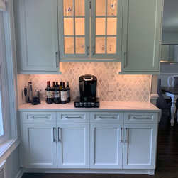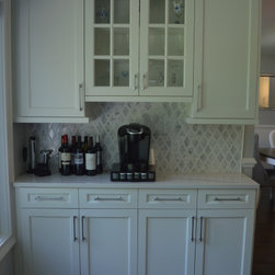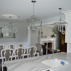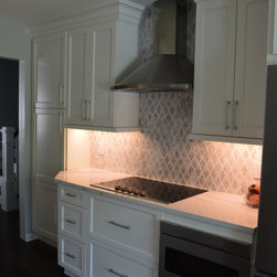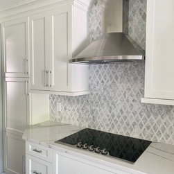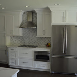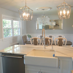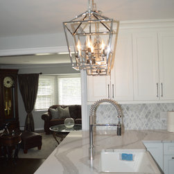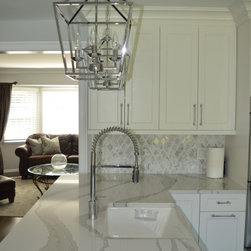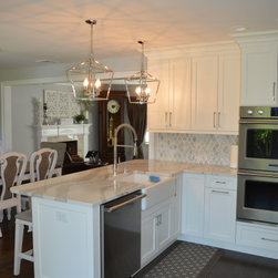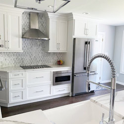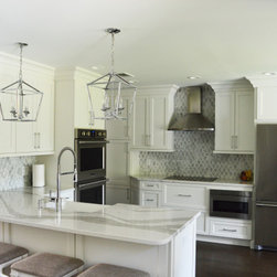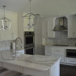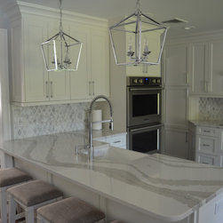 Bright white and gray kitchen design. Unique wave gray and white countertop. Modern cabinets and unique light fixtures complete this look.