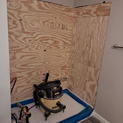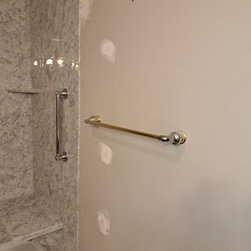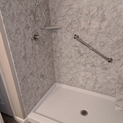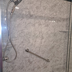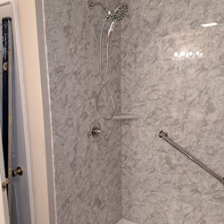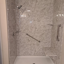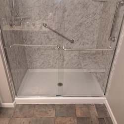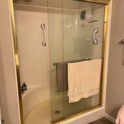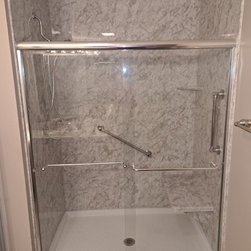 We removed a standard fiberglass shower and installed a custom luxury bath walk in shower with chrome fixtures and a glass door.