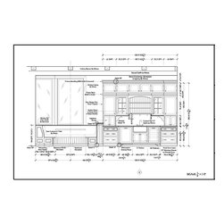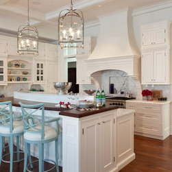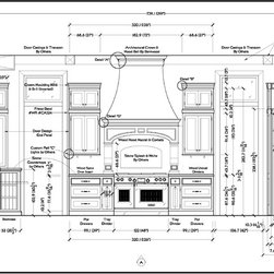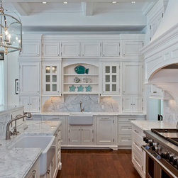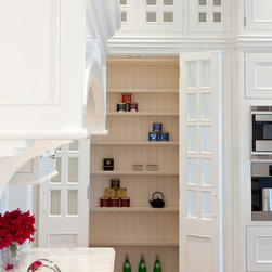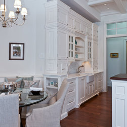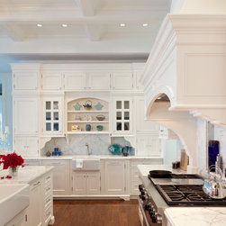 Symmetry, harmony, purity -- how to infuse these classical design elements into an asymmetrical, modern floor plan? This whole-house renovation opened the kitchen to adjoining family room for easy living. However, the combined space was ever-so-skewed. The architectural ceiling beams followed their own logic. The bay window was cattywampus. And while the homeowners desired a full complement of appliances for serious entertaining -- they preferred these to disappear into the white painted woodwork.