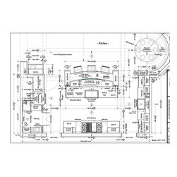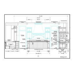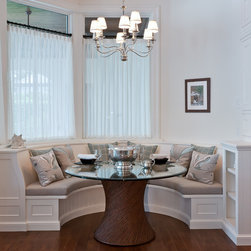 Solution: Add strength to strength. Make each wall of the room a handsome focal point -- visually balanced & bold. The curves of the bell-shaped range hood anchor the west wall -- echoed by the soft geometry of the island and circular window seating. The genteel south wall is devoted to cleanup and china display with small appliances tucked away into cubby garages. The north wall works hard, minimizing steps to integrated refrigeration and walk-in pantry larder. Every square inch of this coastal kitchen is utilized for cooking convenience & comfort. Friends are always welcome. Pour yourself a cup of coffee and stay awhile....