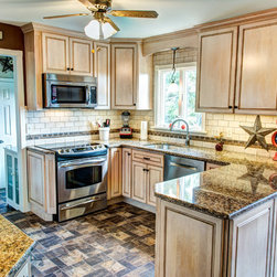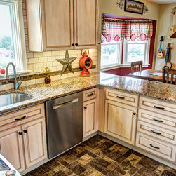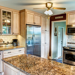 While the overall size of this charming kitchen may not have changed, there were some definite improvements done to the layout. The most notable changes were the elimination of the soffits and build-in pantry, and the relocation of the refrigerator. Bertch St.James cabinets were used throughout, and are made with birch wood in a Snowbank stain and a brown glaze. Cambria Canterbury quartz countertops are finished off with DalTile Torreon 3"x 6"tumbled stone tile. The flooring is Armstrong Durality vinyl flooring. Finer details include a pendant light at the sink, mullion doors with clear glass and 39" high cabinetry with a built-up crown molding.