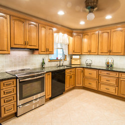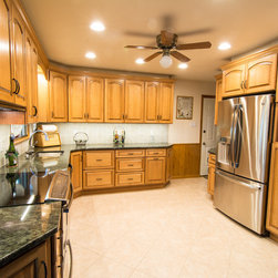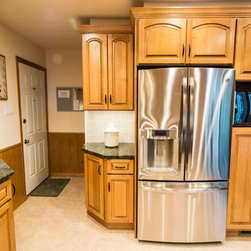 Removing the wall between the dining room and kitchen was what really opened things up in this project. In addition, the soffits were removed, allowing taller cabinets with more space. Bertch 1/4 Sawn Oak cabinetry with a Toffee stain are complimented by Tropical Green granite countertops. The floor is Congoleum DuraCeramic grouted vinyl tile. The refrigerator was moved to a more central location along side of a microwave/pantry. Stainless steel appliances were used throughout, and include a slim Broan 1500 series Silhouette range hood.