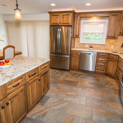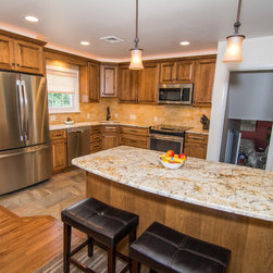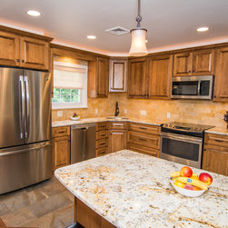Hagerstown Redline cabinetry was used, in their Washington (Raised Panel) door style, in maple wood with a Butternut stain. Beautiful Yellow Sunset granite was installed throughout, and was finished off with Dal-Tile T102 Fossil Ridge Honed Travertine 3”x 6” Tile. The kitchen floor received Dal-Tile Ayer’s Rock AY05 Rustic Remnant 13”x 20” Tile, while the dining room received Mullican Knob Creek 3” Solid Oak Saddle hand scraped hardwood flooring.