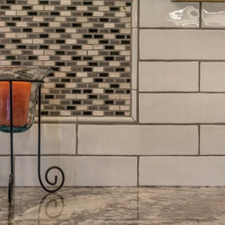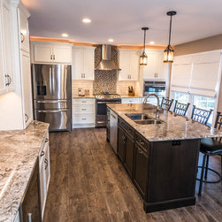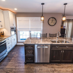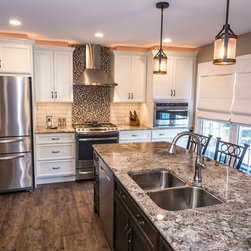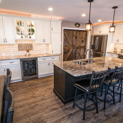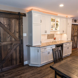 Materials for the project include Bertch's Northbrook flat panel cabinets, with the main cabinets being birch with a Snowflake paint, and the island being birch with a Sable paint. Stunning Magnific granite makes up all of the countertops, with a large double bowl stainless steel sink. Cortec LVT flooring extends from the kitchen all the way through the adjacent family room. Finishing touches include stainless steel appliances, accent tile for a mural as well as the range back splash as well as two custom sliding barn doors.