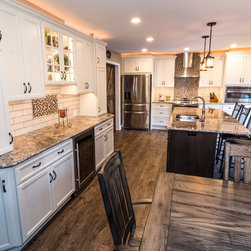 This kitchen features a perfect mix of both rustic charm and elegant touches. The customer wanted to combine the small kitchen and unused dining room to create the perfect open kitchen just waiting for entertaining friends and family. The main kitchen features ample cooking space and a large expansive island. For added space and storage, a large hutch was created, which includes a wine fridge for those friendly gatherings.