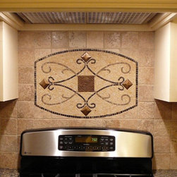 Maicon Gold Backsplash Medallion with Bronze Accents. Medallion colors Jerusalem Gold, Emperador Dark and Emperador Light. These colors can be customized.