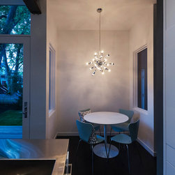 Sputnik pendant features a chrome frame with chrome top bulbs completing the lamp. Twenty-four 25 watt, 120 volt, G16.5 candelabra base chrome top lamps included. General light distribution. Features 60 inch cord. 24W x 24H.