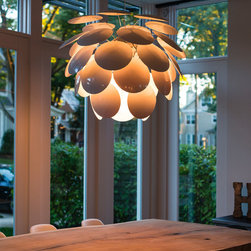 Lilly pendant features a carbon steel body with polycarbonate white discs. Canopy in chrome finish. Available in a small and large size option. Small version comes with one 72 watt, 120 volt, A19 medium base halogen lamp and large comes with three G25 100 watt 120 volt medium base incandescent...
