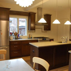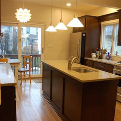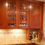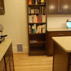 New cherry Dura Supreme Shaker cabinets with a Mocha stain are more in keeping with the character of the house. Some wall cabinets have glass doors and paper was added inside that matches the wall color to visually lighten the dark cabinets and allow displays to be seen. A Zodiac quartz countertop in Mossy Green is easy to care for and looks beautiful. The biscuit gloss subway tile backsplash is accented by a single row of artisan glass tiles. White oak hardwood flooring to match the rest of the house was installed in the kitchen.