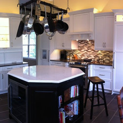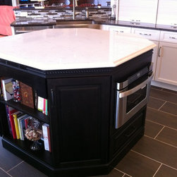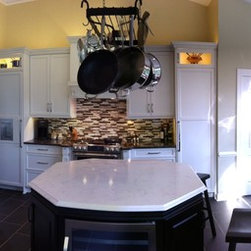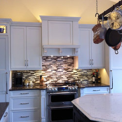 Linear stained glass kitchen backsplash with a rich colored 12x24 size porcelain tile on the kitchen floor.