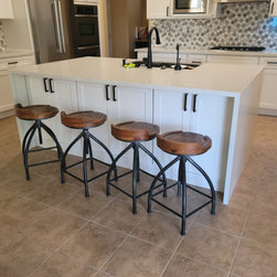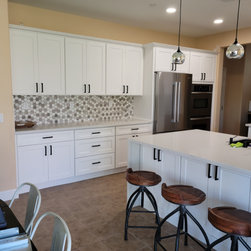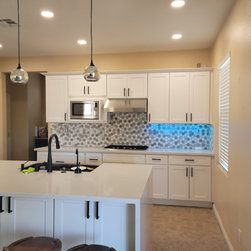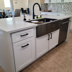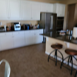 new cabinets, new counter tops with water fall for the island. new backsplash