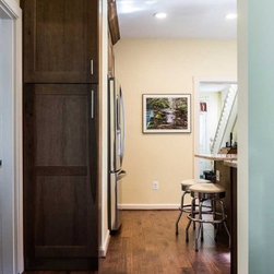Coat closet and half of wall removed/ small column, counter and additional pendant lights installed to existing counter.