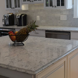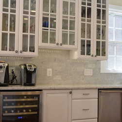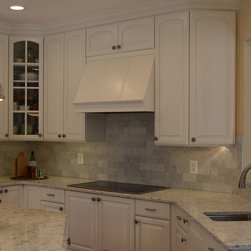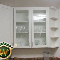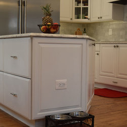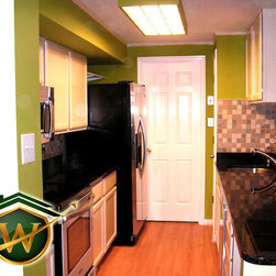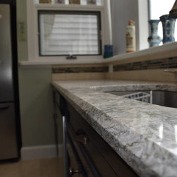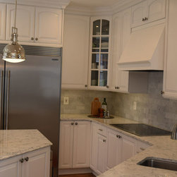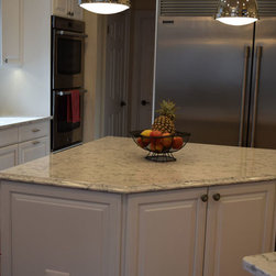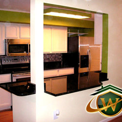 Condo kitchen remodel. White partial overlay Thermofoil cabinets by Contractors Choice . Granite ledge created to accommodate the possibility of placing bar stools for additional dining.