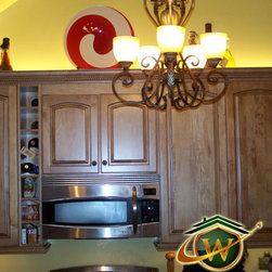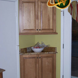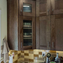 Chocolate glazed over natural angled corner cabinets