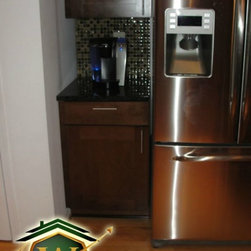 Angled corner cabinets with Verde green Granite countertops