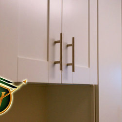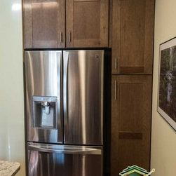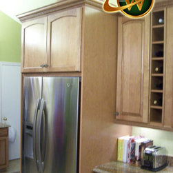 Wolf Designer Cabinets – Murano door style in hickory wood with the Husk finish applied to pantry cabinets with custom stacked crown molding.