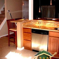 Granite Countertops and Hanging Light Fixtures, electrical outlet added to the area and dish washer relocated