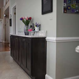 Wolf Designer Cabinets – Murano door style in hickory wood with the Husk finish applied to pantry cabinets with custom stacked crown molding and mini pendant lighting. Sherwin Williams paint color: SW6679 Full Moon