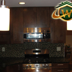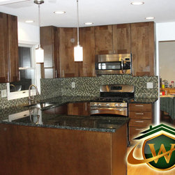 Kitchen Remodel – Maple Wood Kitchen Cabinets with a Harvest Stain, Granite Counter tops, Tile Backsplash and U shaped Design Shaker style Masterbrand Norcraft cabinets