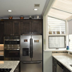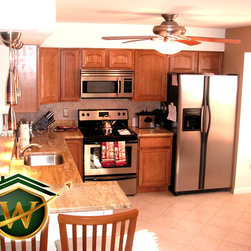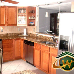 Giallo Granite and stainless steel appliances, Aristokraft cabinets installed. Full wall modified to create Pass thru buffet area.