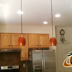 Besa pendant lights with Garnet glass and 6″ recessed lights