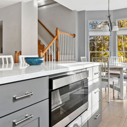 Wolf Designer Cabinets – Murano door style in hickory wood with the Husk finish applied. Cabinets are in a custom 45″ wall cabinet height, with Cambria Quartz in Windermere.