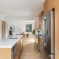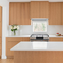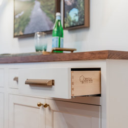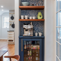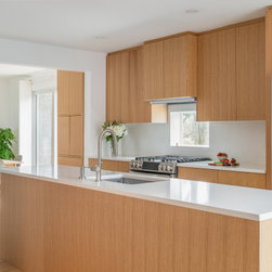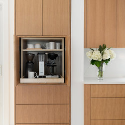 The kitchen cabinetry is custom made by Lion Cabinetry. He took time to grain match each cabinet door to really showcase the beautiful wood and create a natural look. The cabinets push to open to avoid interrupting the sleek surface with hardware. We created a custom coffee station with roll out to...