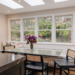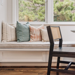 A small bump out off the back of the house bathed this kitchen in light. It created the perfect spot for a cozy banquette area that has quickly become the family's favorite place to gather.
