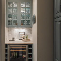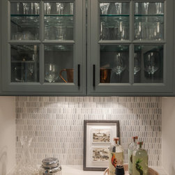 The existing bar just needed a couple tweaks to make it shine. We added a new counter, backsplash, hardware and painted the existing cabinetry.