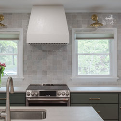 The focal point in this kitchen is the amazing tile backsplash that goes on for days and custom hood with plaster finish. Those cute pendant lights just top things off!