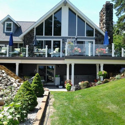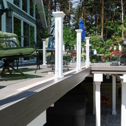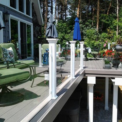 The railing is tempered glass panels by Stevens Glass. The railposts are wolmanized subframe with Acme brand vinyl white post sleeves. The postcaps are custom made on the jobsite with white pvc material.