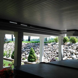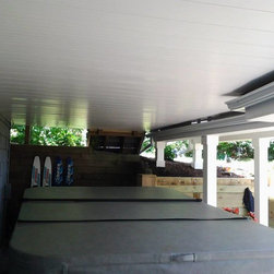 The project has the main support beams and posts wrapped in Azek white PVC and a Drysnap watershed ceiling system was installed underneath the deck to allow the clients to entertain and use the space even if it is raining .