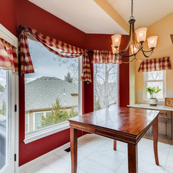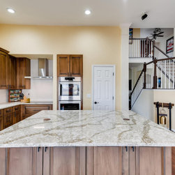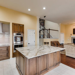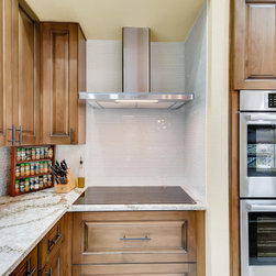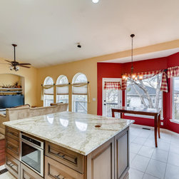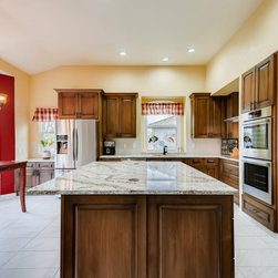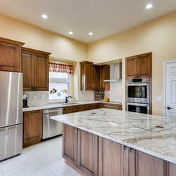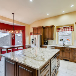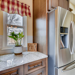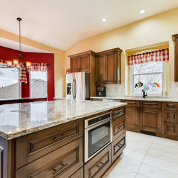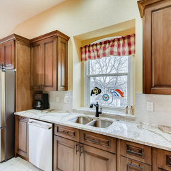 Beautiful & bright traditional kitchen with raised cabinet doors and Cambria quartz counter tops.