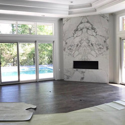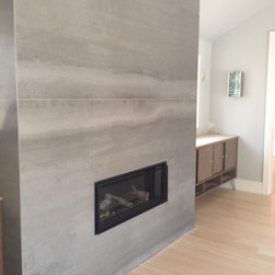 Fireplace wall covered in a large format panel tile.