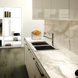 Kitchen backsplash and countertops in large format panels.