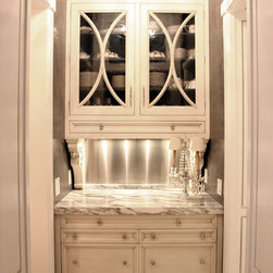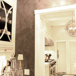 black glass chandelier, glass front cabinets, stainless steel backsplash, marble countertops, butler's pantry, venetian plaster walls, charcoal gray walls