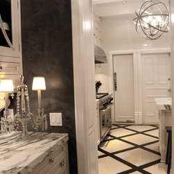 charcoal gray walls, venetian plaster walls, black chandelier, butler's pantry, graphic tile and wood floors, marble countertops, glass front cabinets, glam, chandelier