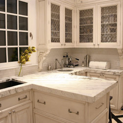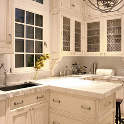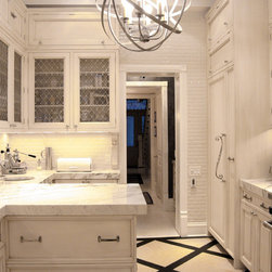 small kitchen, glam, iron chandelier, graphic stone and wood floor, marble countertops, prep sink, diamond mesh metal inserts, mini brick subway tile, box beam ceiling