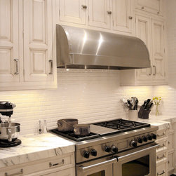 mini brick subway tile, stainless steel hood, marble countertops, vintage latch hardware