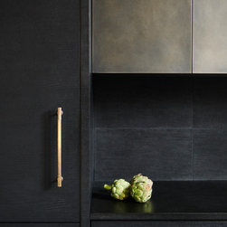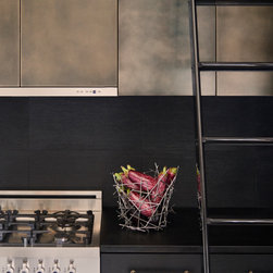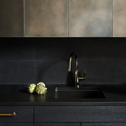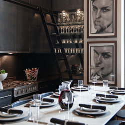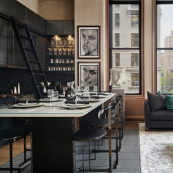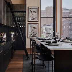 This project was a gut renovation of a loft on Park Ave. South in Manhattan – it’s the personal residence of Andrew Petronio, partner at KA Design Group. Bilotta Senior Designer, Jeff Eakley, has worked with KA Design for 20 years. When it was time for Andrew to do his own kitchen, working with Jeff was a natural choice to bring it to life. Andrew wanted a modern, industrial, European-inspired aesthetic throughout his NYC loft. The allotted kitchen space wasn’t very big; it had to be designed in such a way that it was compact, yet functional, to allow for both plenty of storage and dining. Having an island look out over the living room would be too heavy in the space; instead they opted for a bar height table and added a second tier of cabinets for extra storage above the walls, accessible from the black-lacquer rolling library ladder. The dark finishes were selected to separate the kitchen from the rest of the vibrant, art-filled living area – a mix of dark textured wood and a contrasting smooth metal, all custom-made in Bilotta Collection Cabinetry. The base cabinets and refrigerator section are a horizontal-grained rift cut white oak with an Ebony stain and a wire-brushed finish. The wall cabinets are the focal point – stainless steel with a dark patina that brings out black and gold hues, picked up again in the blackened, brushed gold decorative hardware from H. Theophile. The countertops by Eastern Stone are a smooth Black Absolute; the backsplash is a black textured limestone from Artistic Tile that mimics the finish of the base cabinets. The far corner is all mirrored, elongating the room. They opted for the all black Bertazzoni range and wood appliance panels for a clean, uninterrupted run of cabinets.