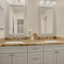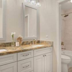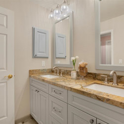 The white, birch powder and hall bathroom cabinets were hand chosen to compliment the neutral toned vanity tops. Having all three-bathroom vanity tops in neutral tones allows for a feeling of cohesiveness and will be a timeless look in the years to come.