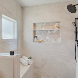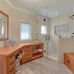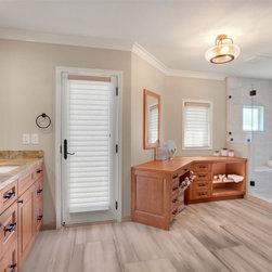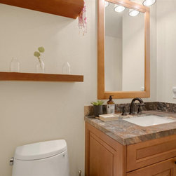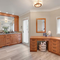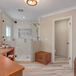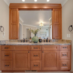 It was important to our clients that the renovations of the master, hall, and powder bathrooms were updated but still held the traditional and timeless feeling. Birch veneer finish for the custom cabinetry, light cream shower tile and a frosted window in the master shower, allowed for more natural light to stream in and create a feeling of openness.