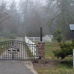 The driveway at this horse ranch is quite long. While not impossible, it would have been expensive, and extremely invasive to the landscaping, to lay wire from the power source to the gate. Instead, the client opted for solar energy. This gate features a true Pacific Northwest, custom designed...