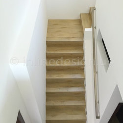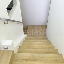 All the architectural features of this staircase are square and rectangular without appearing severe or harsh. The beautiful wood flooring against the modern white are classic and simple. Notice the wall cutout as well – we love this special detail!