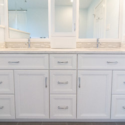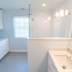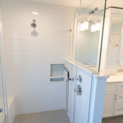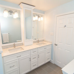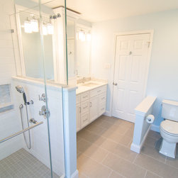Here is yet another example of a continuing trend we are seeing when remodeling master baths. The original bathroom had an oversize whirlpool tub and a small shower. The client wanted to remove the tub entirely, and in it's place create a large walk-in shower. The final layout does just that. Now the bathroom sports a spacious walk-in shower, additional cabinet space (where the shower was formally located), and a large double bowl vanity with center medicine cabinet tower.