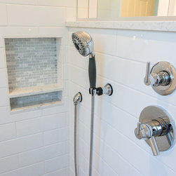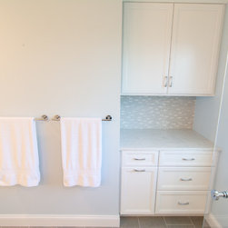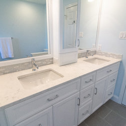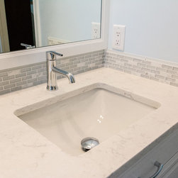 Materials include Danken custom maple cabinetry in Pure White, Viatera Minuet quartz surfaces, Kohler white Archer toilet and Caxton square sinks and Delta Trinsic Polished Chrome faucets. DalTile Kimona Silk P325 Morning Dove 12"x 24" tile was used on the floor and Modern Dimensions 0190 Gloss Arctic White 4"x 12" tile was used in the shower. Westside Glass MA81-LB accent tile was used for both the vanity back splash and the shower accents.